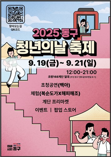 부산광역시 동구(구청장 김진홍)는 청년의 창의와 열정을 응원하고 지역 사회와 소통을 강화하기 위해 오는 9월 19일부터 21일까지 2025년 '동구 청년의 날 축제'를 개최한다고 밝혔다.