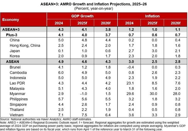 아세안+3 지역의 경제성장률은 2025년 4.1%, 2026년 3.8%로 전망되며, 이는 상반기의 견조한 성장 실적과 예상보다 강한 수출 모멘텀에 힘입어 7월 전망치에서 상향 조정된 것이다. '해방의 날 (Liberation Day)' 관세 발표 이후 4월에 정점에 달했던 시장 압력도 점차 완화되고 있다.